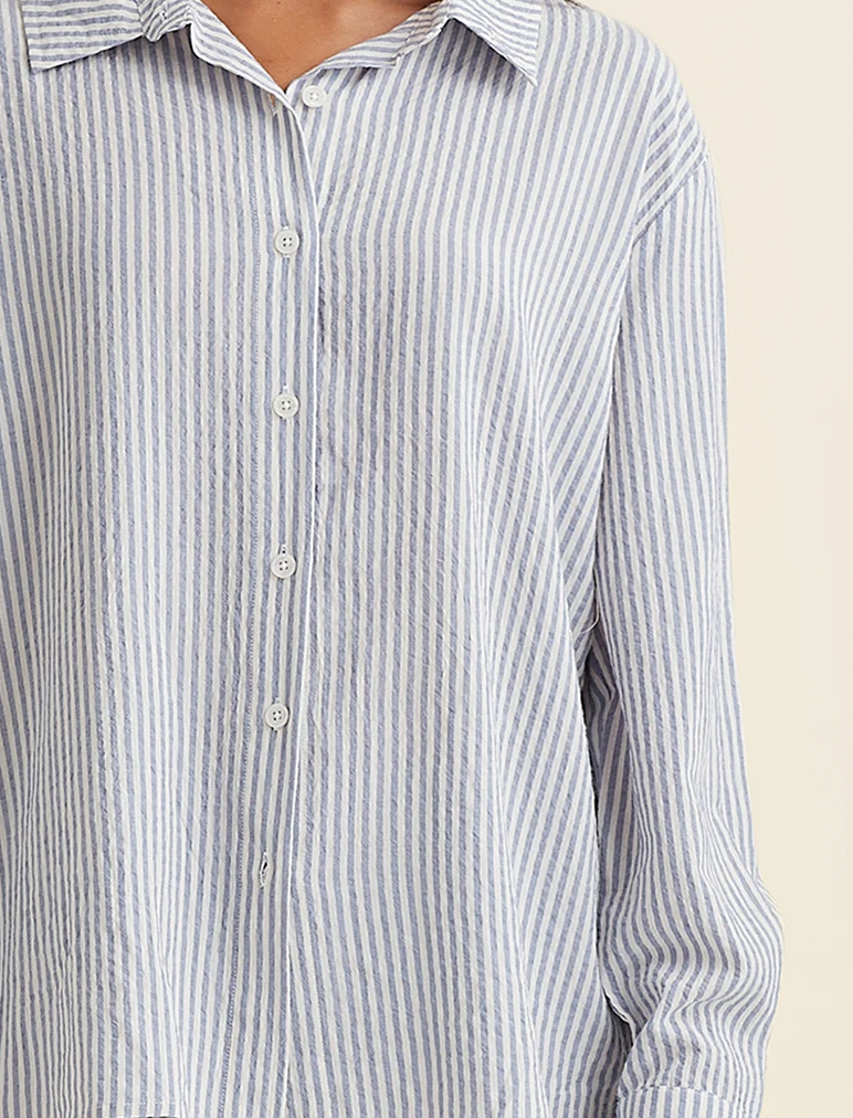 A relaxed boyfriend shirt in a classic French blue stripe. This oversized shirt offers a comfortable and stylish fit for lounging around!